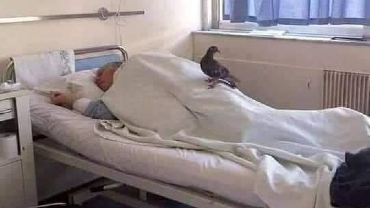 Condividi su:L’immagine mostra un uomo, sembra anziano, in un letto d’ospedale. Sul lenzuolo che lo ricopre c’è un piccione.